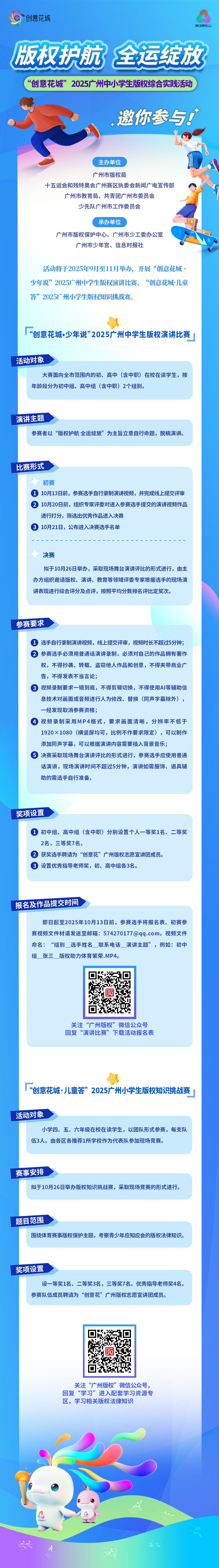 活动将开展“创意花城·少年说”2025广州中学生版权演讲比赛、“创意花城·儿童答”2025广州小学生版权知识挑战赛,无论是善于表达的你,还是热爱知识挑战的你,都能在这里找到属于自己的舞台,快来一起了解活动详情,踊跃参与吧!